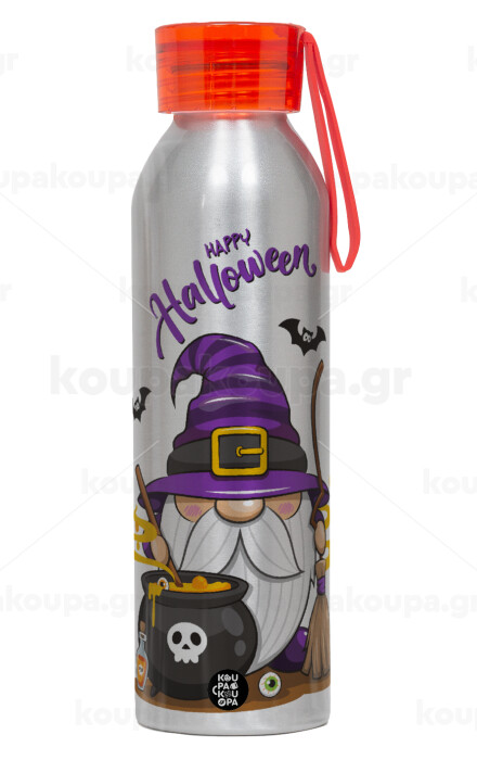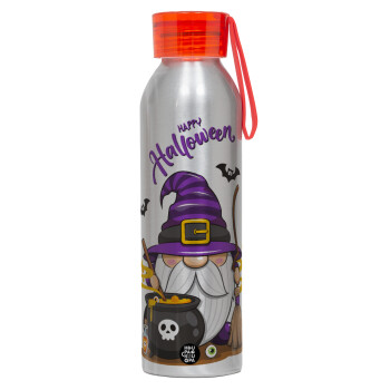 Happy Halloween (Χαλοουίν), Αλουμινένιο Αθλητικό Μπουκάλι 650ml – Ασημί με Κόκκινο Καπάκι και Λουράκι Σιλικόνης