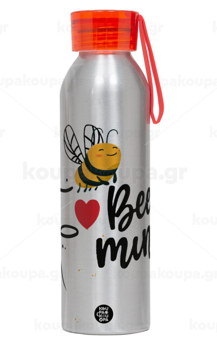 Bee mine!!!, Αλουμινένιο Αθλητικό Μπουκάλι 650ml – Ασημί με Κόκκινο Καπάκι και Λουράκι Σιλικόνης