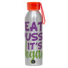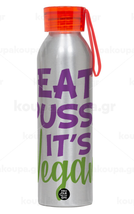 EAT pussy it's vegan, Αλουμινένιο Αθλητικό Μπουκάλι 650ml – Ασημί με Κόκκινο Καπάκι και Λουράκι Σιλικόνης