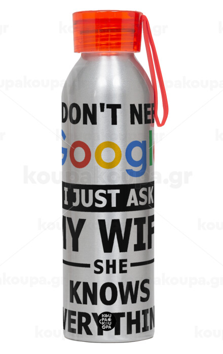 I don't need Google, just ask my WIFE, Αλουμινένιο Αθλητικό Μπουκάλι 650ml – Ασημί με Κόκκινο Καπάκι και Λουράκι Σιλικόνης