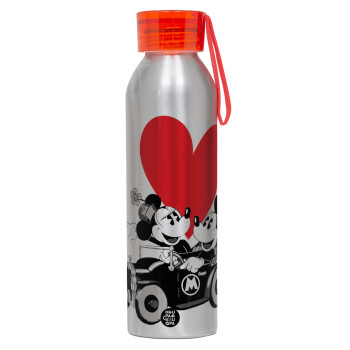 Mickey & Minnie love car, Αλουμινένιο Αθλητικό Μπουκάλι 650ml – Ασημί με Κόκκινο Καπάκι και Λουράκι Σιλικόνης