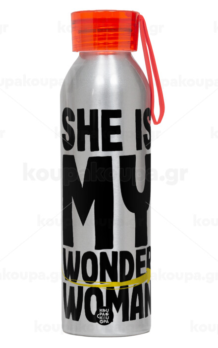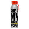 She is my wonder woman, Αλουμινένιο Αθλητικό Μπουκάλι 650ml – Ασημί με Κόκκινο Καπάκι και Λουράκι Σιλικόνης
