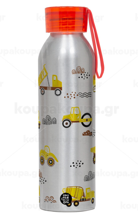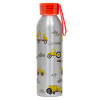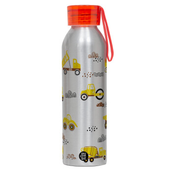 Αμαξάκια φορτωτές και μπουλντόζες, Αλουμινένιο Αθλητικό Μπουκάλι 650ml – Ασημί με Κόκκινο Καπάκι και Λουράκι Σιλικόνης
