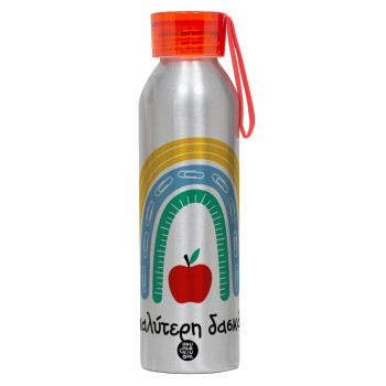 Η καλύτερη δασκάλα, Αλουμινένιο Αθλητικό Μπουκάλι 650ml – Ασημί με Κόκκινο Καπάκι και Λουράκι Σιλικόνης