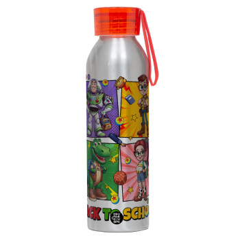 Back to the School Buzz & Friends, Αλουμινένιο Αθλητικό Μπουκάλι 650ml – Ασημί με Κόκκινο Καπάκι και Λουράκι Σιλικόνης