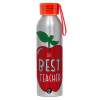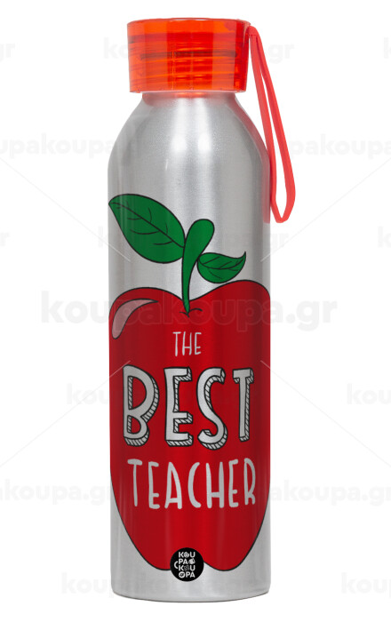 Best teacher, Αλουμινένιο Αθλητικό Μπουκάλι 650ml – Ασημί με Κόκκινο Καπάκι και Λουράκι Σιλικόνης