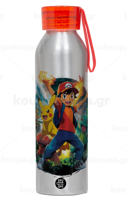 Ash Ketchum & Pikachu, Αλουμινένιο Αθλητικό Μπουκάλι 650ml – Ασημί με Κόκκινο Καπάκι και Λουράκι Σιλικόνης