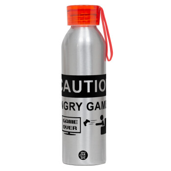 Caution, angry gamer!, Αλουμινένιο Αθλητικό Μπουκάλι 650ml – Ασημί με Κόκκινο Καπάκι και Λουράκι Σιλικόνης