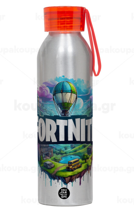 Fortnite land, Αλουμινένιο Αθλητικό Μπουκάλι 650ml – Ασημί με Κόκκινο Καπάκι και Λουράκι Σιλικόνης