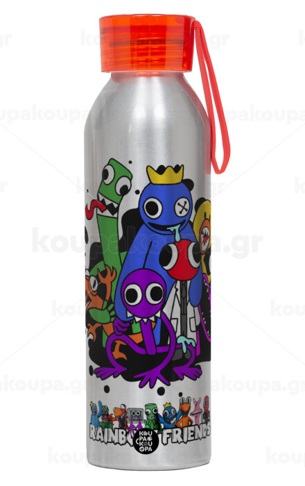 Rainbow friends, Αλουμινένιο Αθλητικό Μπουκάλι 650ml – Ασημί με Κόκκινο Καπάκι και Λουράκι Σιλικόνης