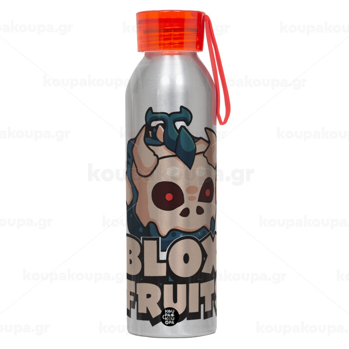 Roblox Blox Fruits, Αλουμινένιο Αθλητικό Μπουκάλι 650ml – Ασημί με Κόκκινο Καπάκι και Λουράκι Σιλικόνης