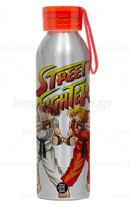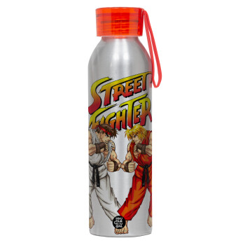 Street fighter, Αλουμινένιο Αθλητικό Μπουκάλι 650ml – Ασημί με Κόκκινο Καπάκι και Λουράκι Σιλικόνης