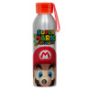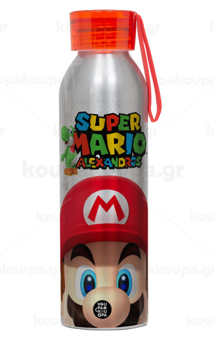 Super mario head, Αλουμινένιο Αθλητικό Μπουκάλι 650ml – Ασημί με Κόκκινο Καπάκι και Λουράκι Σιλικόνης