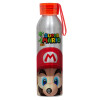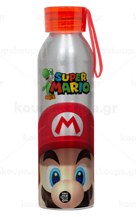 Super mario, Αλουμινένιο Αθλητικό Μπουκάλι 650ml – Ασημί με Κόκκινο Καπάκι και Λουράκι Σιλικόνης