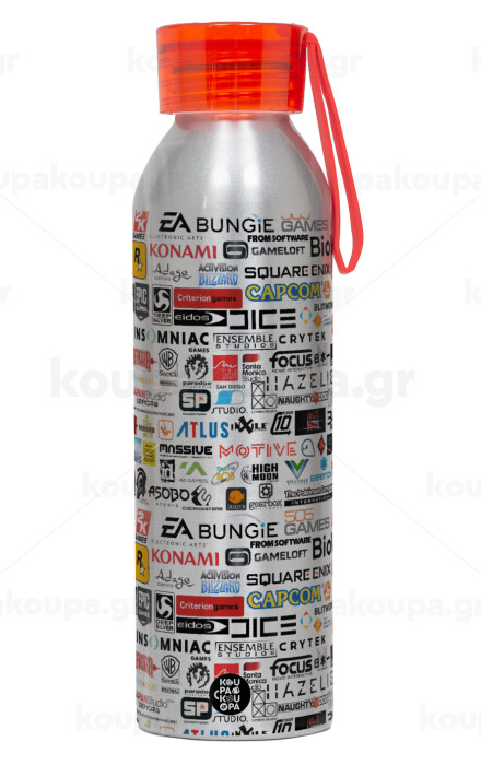 Video Game Studio Logos, Αλουμινένιο Αθλητικό Μπουκάλι 650ml – Ασημί με Κόκκινο Καπάκι και Λουράκι Σιλικόνης