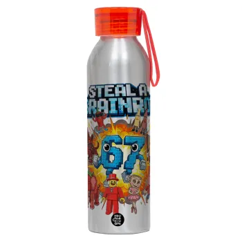 Steal a Brainrot 67 Roblox Style, Αλουμινένιο Αθλητικό Μπουκάλι 650ml – Ασημί με Κόκκινο Καπάκι και Λουράκι Σιλικόνης