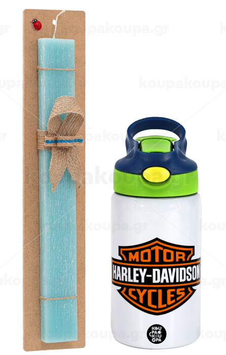 Motor Harley Davidson, Πασχαλινή Λαμπάδα με Παιδικό παγούρι θερμό, ανοξείδωτο, με καλαμάκι ασφαλείας, πράσινο/μπλε (350ml) & κερί αρωματικό πλακέ (30cm) (ΤΙΡΚΟΥΑΖ)