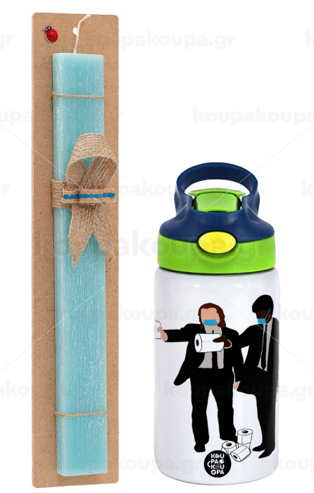 Pulp Fiction 3 meter away, Πασχαλινή Λαμπάδα με Παιδικό παγούρι θερμό, ανοξείδωτο, με καλαμάκι ασφαλείας, πράσινο/μπλε (350ml) & κερί αρωματικό πλακέ (30cm) (ΤΙΡΚΟΥΑΖ)