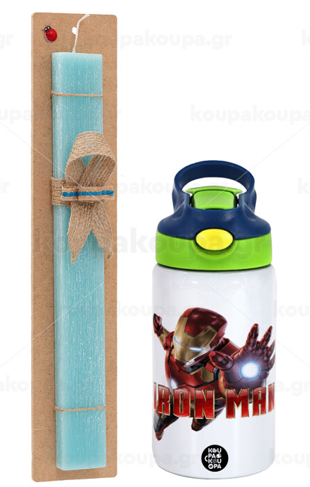 Ironman, Πασχαλινή Λαμπάδα με Παιδικό παγούρι θερμό, ανοξείδωτο, με καλαμάκι ασφαλείας, πράσινο/μπλε (350ml) & κερί αρωματικό πλακέ (30cm) (ΤΙΡΚΟΥΑΖ)