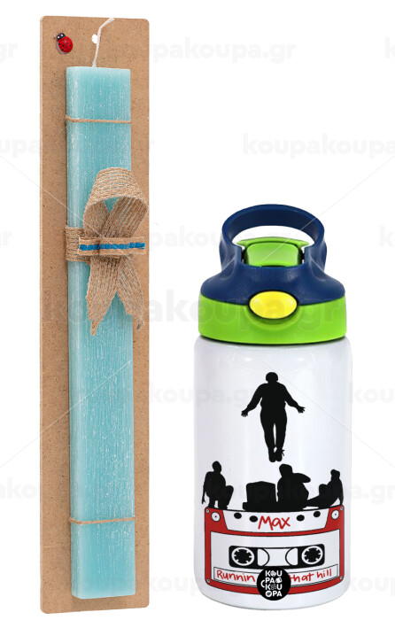 Running up that hill, Stranger Things, Πασχαλινή Λαμπάδα με Παιδικό παγούρι θερμό, ανοξείδωτο, με καλαμάκι ασφαλείας, πράσινο/μπλε (350ml) & κερί αρωματικό πλακέ (30cm) (ΤΙΡΚΟΥΑΖ)