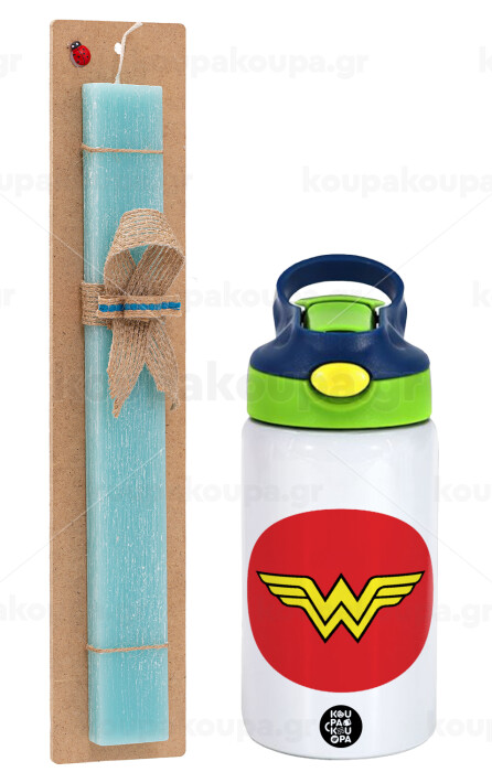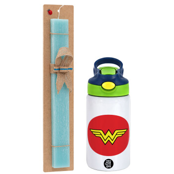 Wonder woman, Πασχαλινή Λαμπάδα με Παιδικό παγούρι θερμό, ανοξείδωτο, με καλαμάκι ασφαλείας, πράσινο/μπλε (350ml) & κερί αρωματικό πλακέ (30cm) (ΤΙΡΚΟΥΑΖ)