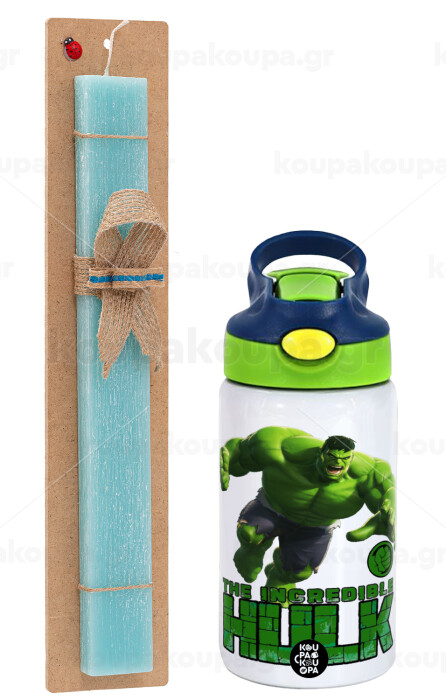 Hulk, Πασχαλινή Λαμπάδα με Παιδικό παγούρι θερμό, ανοξείδωτο, με καλαμάκι ασφαλείας, πράσινο/μπλε (350ml) & κερί αρωματικό πλακέ (30cm) (ΤΙΡΚΟΥΑΖ)
