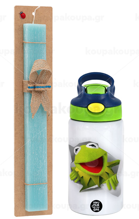 Kermit the frog, Πασχαλινή Λαμπάδα με Παιδικό παγούρι θερμό, ανοξείδωτο, με καλαμάκι ασφαλείας, πράσινο/μπλε (350ml) & κερί αρωματικό πλακέ (30cm) (ΤΙΡΚΟΥΑΖ)