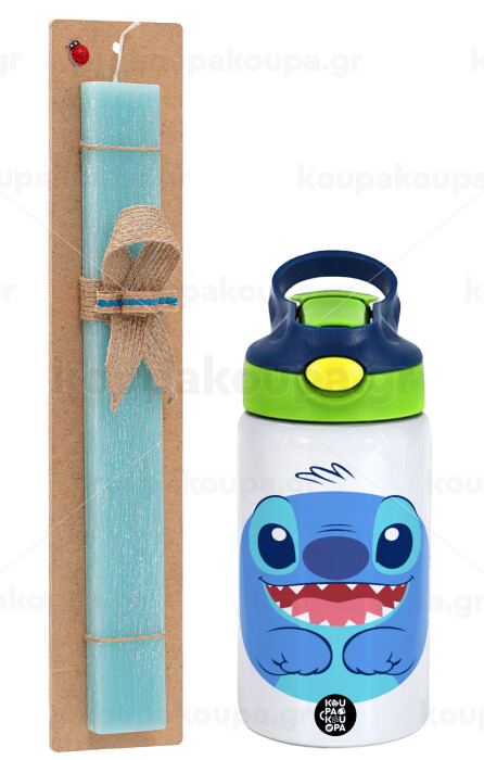 Lilo & Stitch blue, Πασχαλινή Λαμπάδα με Παιδικό παγούρι θερμό, ανοξείδωτο, με καλαμάκι ασφαλείας, πράσινο/μπλε (350ml) & κερί αρωματικό πλακέ (30cm) (ΤΙΡΚΟΥΑΖ)