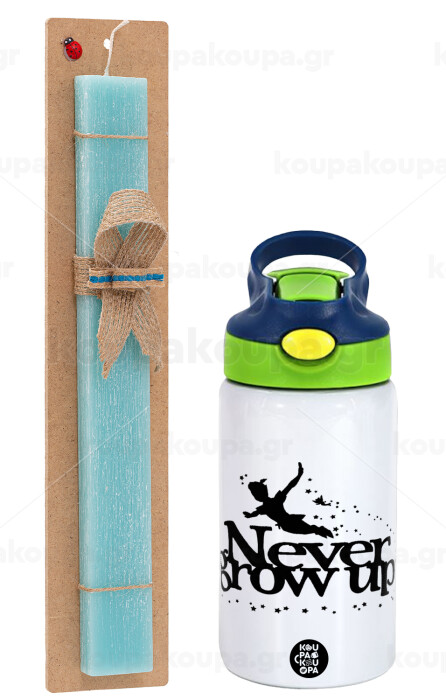 Peter pan, Never Grow UP, Πασχαλινή Λαμπάδα με Παιδικό παγούρι θερμό, ανοξείδωτο, με καλαμάκι ασφαλείας, πράσινο/μπλε (350ml) & κερί αρωματικό πλακέ (30cm) (ΤΙΡΚΟΥΑΖ)