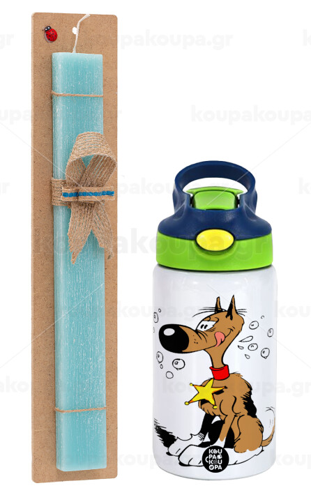 Rantanplan (Ρανταπλάν), Πασχαλινή Λαμπάδα με Παιδικό παγούρι θερμό, ανοξείδωτο, με καλαμάκι ασφαλείας, πράσινο/μπλε (350ml) & κερί αρωματικό πλακέ (30cm) (ΤΙΡΚΟΥΑΖ)