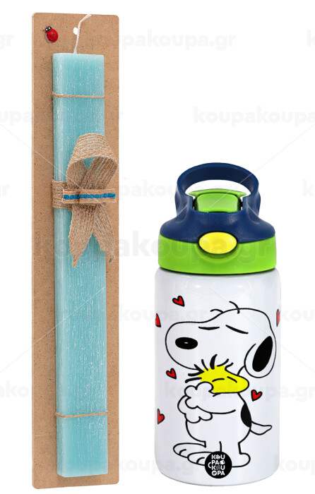 Snoopy Love, Πασχαλινή Λαμπάδα με Παιδικό παγούρι θερμό, ανοξείδωτο, με καλαμάκι ασφαλείας, πράσινο/μπλε (350ml) & κερί αρωματικό πλακέ (30cm) (ΤΙΡΚΟΥΑΖ)