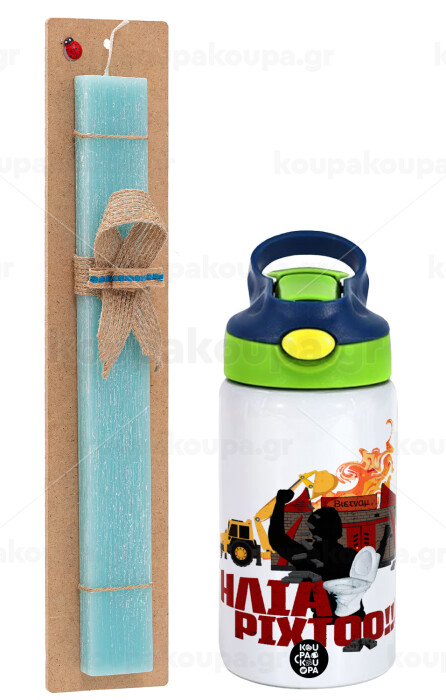 Ηλία ρίχτοοο!!!, Πασχαλινή Λαμπάδα με Παιδικό παγούρι θερμό, ανοξείδωτο, με καλαμάκι ασφαλείας, πράσινο/μπλε (350ml) & κερί αρωματικό πλακέ (30cm) (ΤΙΡΚΟΥΑΖ)