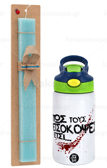 Πως τους πετσόκοψες έτσι..., Πασχαλινή Λαμπάδα με Παιδικό παγούρι θερμό, ανοξείδωτο, με καλαμάκι ασφαλείας, πράσινο/μπλε (350ml) & κερί αρωματικό πλακέ (30cm) (ΤΙΡΚΟΥΑΖ)