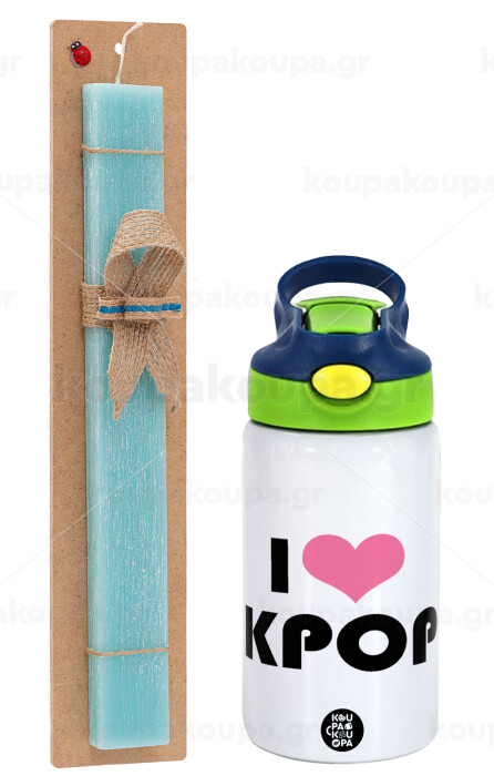 I Love KPOP, Πασχαλινή Λαμπάδα με Παιδικό παγούρι θερμό, ανοξείδωτο, με καλαμάκι ασφαλείας, πράσινο/μπλε (350ml) & κερί αρωματικό πλακέ (30cm) (ΤΙΡΚΟΥΑΖ)