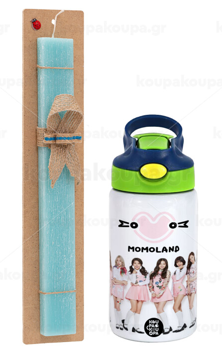Momoland pink, Πασχαλινή Λαμπάδα με Παιδικό παγούρι θερμό, ανοξείδωτο, με καλαμάκι ασφαλείας, πράσινο/μπλε (350ml) & κερί αρωματικό πλακέ (30cm) (ΤΙΡΚΟΥΑΖ)