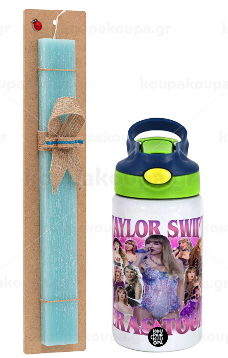 Taylor Swift, Πασχαλινή Λαμπάδα με Παιδικό παγούρι θερμό, ανοξείδωτο, με καλαμάκι ασφαλείας, πράσινο/μπλε (350ml) & κερί αρωματικό πλακέ (30cm) (ΤΙΡΚΟΥΑΖ)