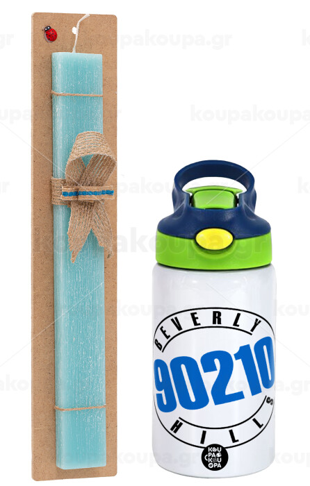 Beverly Hills, 90210, Πασχαλινή Λαμπάδα με Παιδικό παγούρι θερμό, ανοξείδωτο, με καλαμάκι ασφαλείας, πράσινο/μπλε (350ml) & κερί αρωματικό πλακέ (30cm) (ΤΙΡΚΟΥΑΖ)