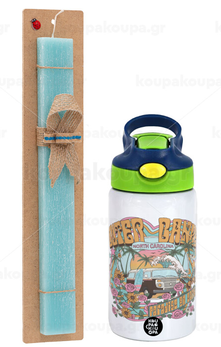 Outerbanks paradise on earth, Πασχαλινή Λαμπάδα με Παιδικό παγούρι θερμό, ανοξείδωτο, με καλαμάκι ασφαλείας, πράσινο/μπλε (350ml) & κερί αρωματικό πλακέ (30cm) (ΤΙΡΚΟΥΑΖ)