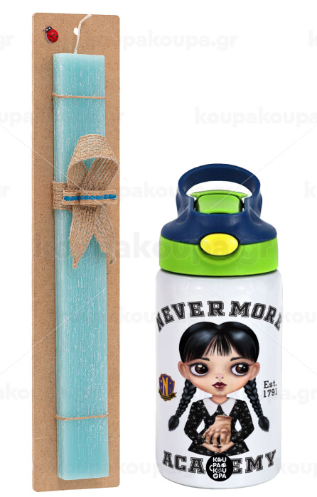 Wednesday Adams, nevermore, Πασχαλινή Λαμπάδα με Παιδικό παγούρι θερμό, ανοξείδωτο, με καλαμάκι ασφαλείας, πράσινο/μπλε (350ml) & κερί αρωματικό πλακέ (30cm) (ΤΙΡΚΟΥΑΖ)