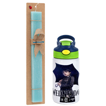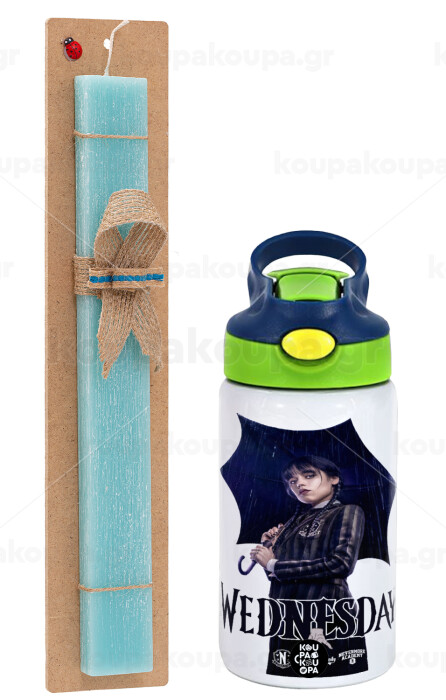 Wednesday rain, Πασχαλινή Λαμπάδα με Παιδικό παγούρι θερμό, ανοξείδωτο, με καλαμάκι ασφαλείας, πράσινο/μπλε (350ml) & κερί αρωματικό πλακέ (30cm) (ΤΙΡΚΟΥΑΖ)