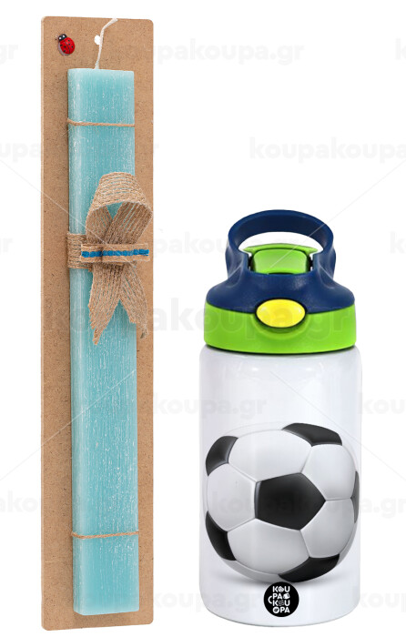 Μπάλα ποδοσφαίρου, Πασχαλινή Λαμπάδα με Παιδικό παγούρι θερμό, ανοξείδωτο, με καλαμάκι ασφαλείας, πράσινο/μπλε (350ml) & κερί αρωματικό πλακέ (30cm) (ΤΙΡΚΟΥΑΖ)