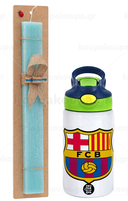 Barcelona FC, Πασχαλινή Λαμπάδα με Παιδικό παγούρι θερμό, ανοξείδωτο, με καλαμάκι ασφαλείας, πράσινο/μπλε (350ml) & κερί αρωματικό πλακέ (30cm) (ΤΙΡΚΟΥΑΖ)