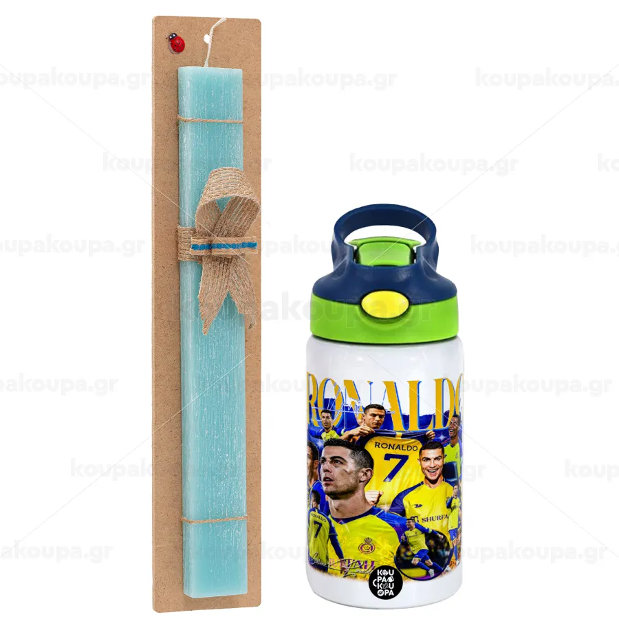 Cristiano Ronaldo Al Nassr, Πασχαλινή Λαμπάδα με Παιδικό παγούρι θερμό, ανοξείδωτο, με καλαμάκι ασφαλείας, πράσινο/μπλε (350ml) & κερί αρωματικό πλακέ (30cm) (ΤΙΡΚΟΥΑΖ)
