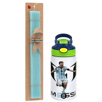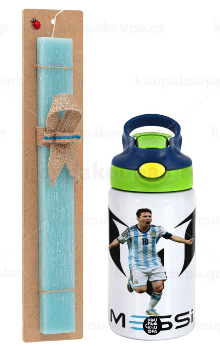 Λιονέλ Μέσι, Leo Messi, Πασχαλινή Λαμπάδα με Παιδικό παγούρι θερμό, ανοξείδωτο, με καλαμάκι ασφαλείας, πράσινο/μπλε (350ml) & κερί αρωματικό πλακέ (30cm) (ΤΙΡΚΟΥΑΖ)