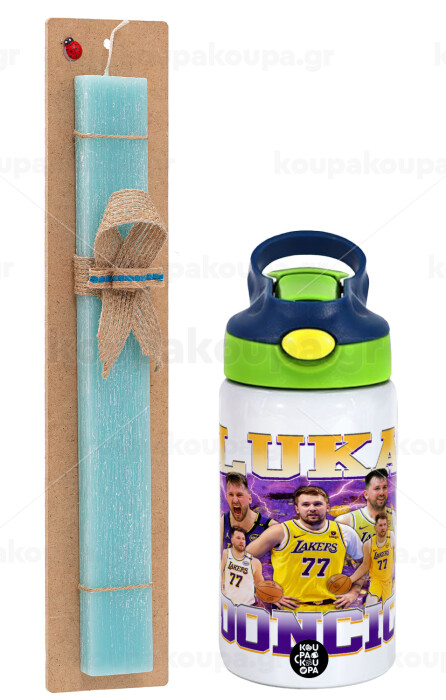 Luka Doncic Basketball , Πασχαλινή Λαμπάδα με Παιδικό παγούρι θερμό, ανοξείδωτο, με καλαμάκι ασφαλείας, πράσινο/μπλε (350ml) & κερί αρωματικό πλακέ (30cm) (ΤΙΡΚΟΥΑΖ)