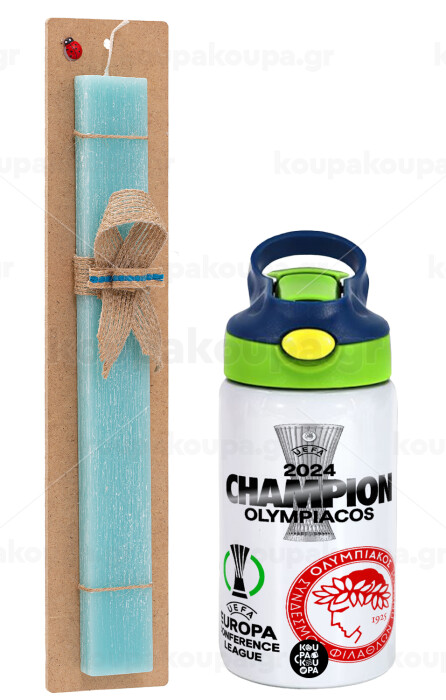 Olympiacos UEFA Europa Conference League Champion 2024, Πασχαλινή Λαμπάδα με Παιδικό παγούρι θερμό, ανοξείδωτο, με καλαμάκι ασφαλείας, πράσινο/μπλε (350ml) & κερί αρωματικό πλακέ (30cm) (ΤΙΡΚΟΥΑΖ)