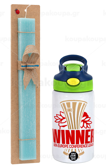 Europa Conference League WINNER, Πασχαλινή Λαμπάδα με Παιδικό παγούρι θερμό, ανοξείδωτο, με καλαμάκι ασφαλείας, πράσινο/μπλε (350ml) & κερί αρωματικό πλακέ (30cm) (ΤΙΡΚΟΥΑΖ)