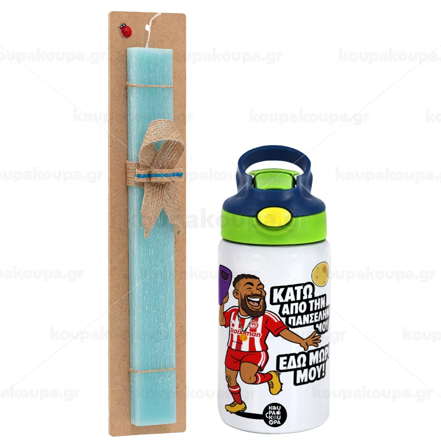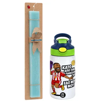 Ροντινέι, "ΚΑΤΩ ΑΠΟ ΤΗΝ ΠΑΝΣΕΛΗΝΟ ΜΟΥ!", Πασχαλινή Λαμπάδα με Παιδικό παγούρι θερμό, ανοξείδωτο, με καλαμάκι ασφαλείας, πράσινο/μπλε (350ml) & κερί αρωματικό πλακέ (30cm) (ΤΙΡΚΟΥΑΖ)