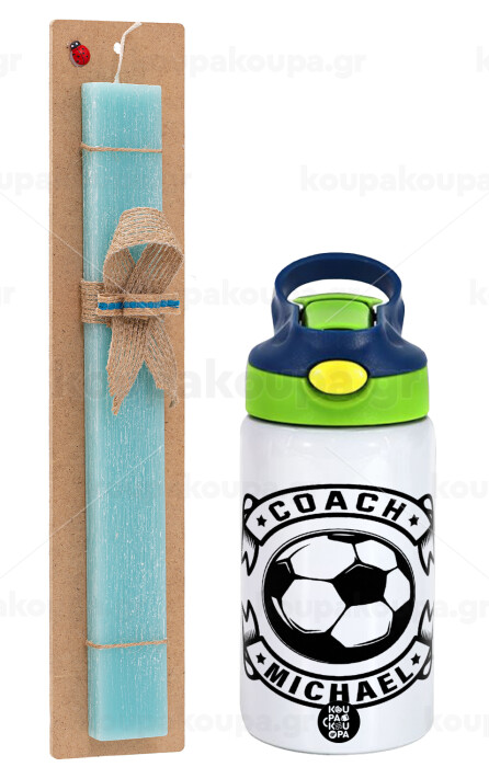 Soccer coach, Πασχαλινή Λαμπάδα με Παιδικό παγούρι θερμό, ανοξείδωτο, με καλαμάκι ασφαλείας, πράσινο/μπλε (350ml) & κερί αρωματικό πλακέ (30cm) (ΤΙΡΚΟΥΑΖ)