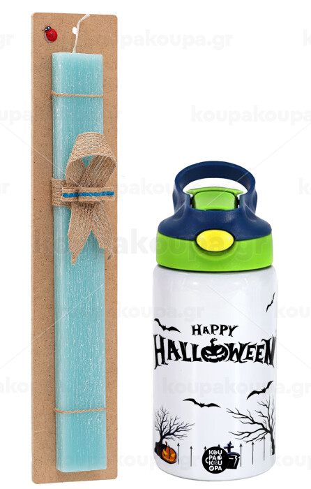 Happy Halloween cemetery, Πασχαλινή Λαμπάδα με Παιδικό παγούρι θερμό, ανοξείδωτο, με καλαμάκι ασφαλείας, πράσινο/μπλε (350ml) & κερί αρωματικό πλακέ (30cm) (ΤΙΡΚΟΥΑΖ)